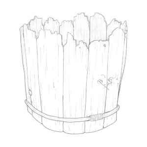 The cask included a total of 16 staves and measured 2.5 feet in diameter. Each stave measures about 2 feet long and between 5.75 to 7 inches wide, and all have a small carved linear groove on the interior, 2.5 inches from the bottom edge of the wood. These 3mm wide lines are croze lines, where the planks of wood that formed the head, or end of the cask were inserted in order to seal it. The top and bottom ends had been removed from the cask before it was placed into the well, although two sections of the head of a cask were recovered during excavations of the well feature and it is possible that they are related to this cask. Three wooden hoops wrapped around the bottom exterior of the cask helped to keep the cask staves in place.
