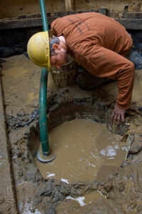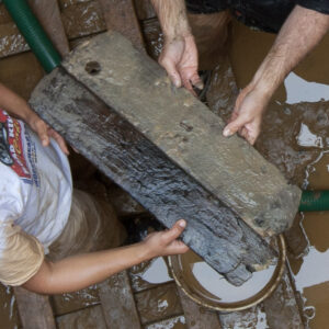 This incredible artifact was once a large cylindrical wooden container called a cask. It has been preserved because it was found by archaeologists at the very bottom of Jamestown’s first well in waterlogged soils. This anaerobic environment preserved the cask, as bacteria that requires oxygen to thrive couldn’t develop and degrade the fragile wooden staves. The cask was placed inside the well by the colonists to serve as a lining for the water reservoir of the well, and it was found by Jamestown archaeologists about 12 feet below ground.