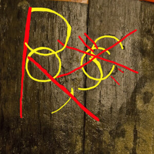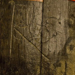 Two staves have carvings on their exteriors, markings which span the two boards. The mark appears to be a large letter R with a small circle carved on top of the middle of the letter, and a set of three overlapping circles to the right of the large letter R. There may also be a small letter X carved just to the right of the large letter R. Unfortunately, these markings are a mystery to us today. They may have been made by the cooper who made the cask, or could have been carved into the cask by a supplier, an inspector, or someone responsible for the cask during the transatlantic journey.
